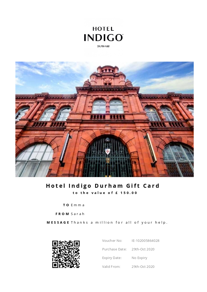 Hotel Indigo Durham allows you to purchase instantly printable gift vouchers, special offers and tickets using the Voucher Connect platform.